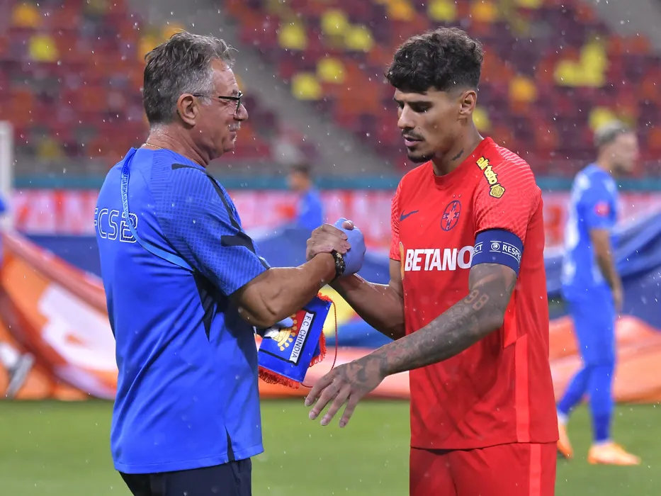 Florinel Teodor Coman preda fanionul primit la meciul de fotbal dintre FCSB si Chindia Targoviste, contand pentru Superliga Superbet, desfasurat pe Arena Nationala din Bucuresti, duminica 14 august 2022. © FOTO:Razvan Pasarica/SPORT PICTURES