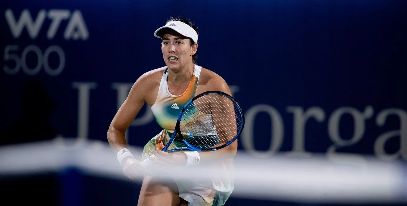 Katerina Siniakova (CZE) vs Garbine Muguruza (ESP) during their Singles Round 1 match as part of the Dubai Duty Free Tennis Championships WTA 500 on February 15, 2022 in Dubai, United Arab Emirates. Photo by Victor Fraile / Power Sport Images