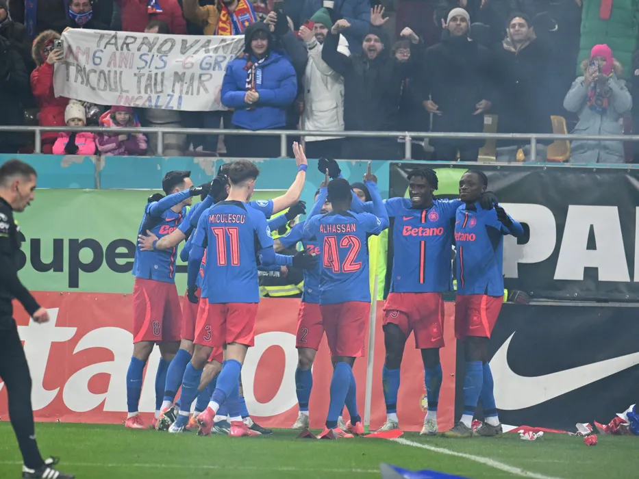 Bucurie a fotbaliștilor ros-albastrii Baba Alhassan, Jordan Youri Gele si Joyskim Aurelien Dawa Tchakonte după un gol marcat in meciul de fotbal dintre FCSB si Dinamo Bucuresti, din cadrul Superligii Superbet, desfasurat pe Arena Nationala din Bucuresti, duminica 23 februarie 2025. © FOTO:Razvan Pasarica/SPORT PICTURES