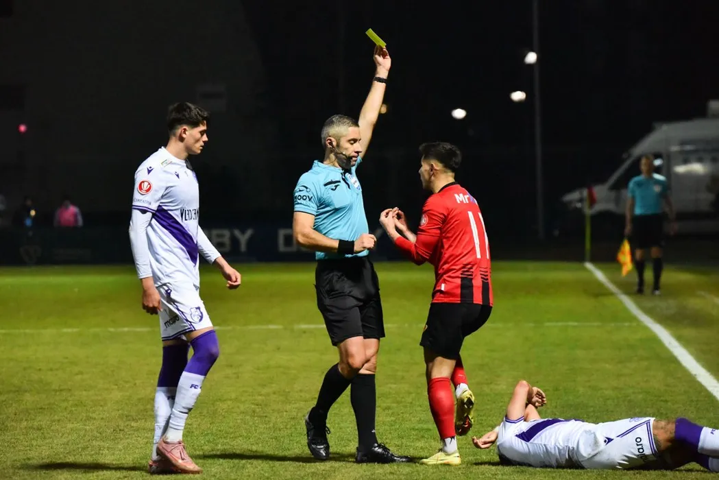 Arbitrul central Radu Petrescu ii arata cartonasul galben lui Francisco Anderson Ceará pentru un fault asupra lui Robert Marian Moldoveanu in meciul de fotbal dintre FK Csikszereda Miercurea Ciuc si FC Arges, contand pentru Superliga Superbet, desfasurat pe Stadionul Municipal din Miercurea Ciuc, sambata 6 decembrie 2025. © FOTO:Zoltan Pal/SPORT PICTURES