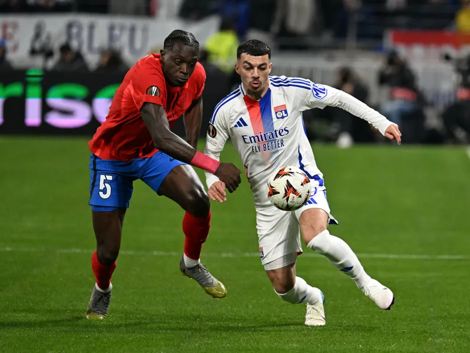 Joyskim Aurelien Dawa Tchakonte si Georges Mikautadze in meciul de fotbal dintre Olympique Lyon si FCSB din cadrul UEFA Europa League, desfasurat pe Groupama Arena din Lyon, joi 13 martie 2025. © FOTO:Razvan Pasarica/SPORT PICTURES