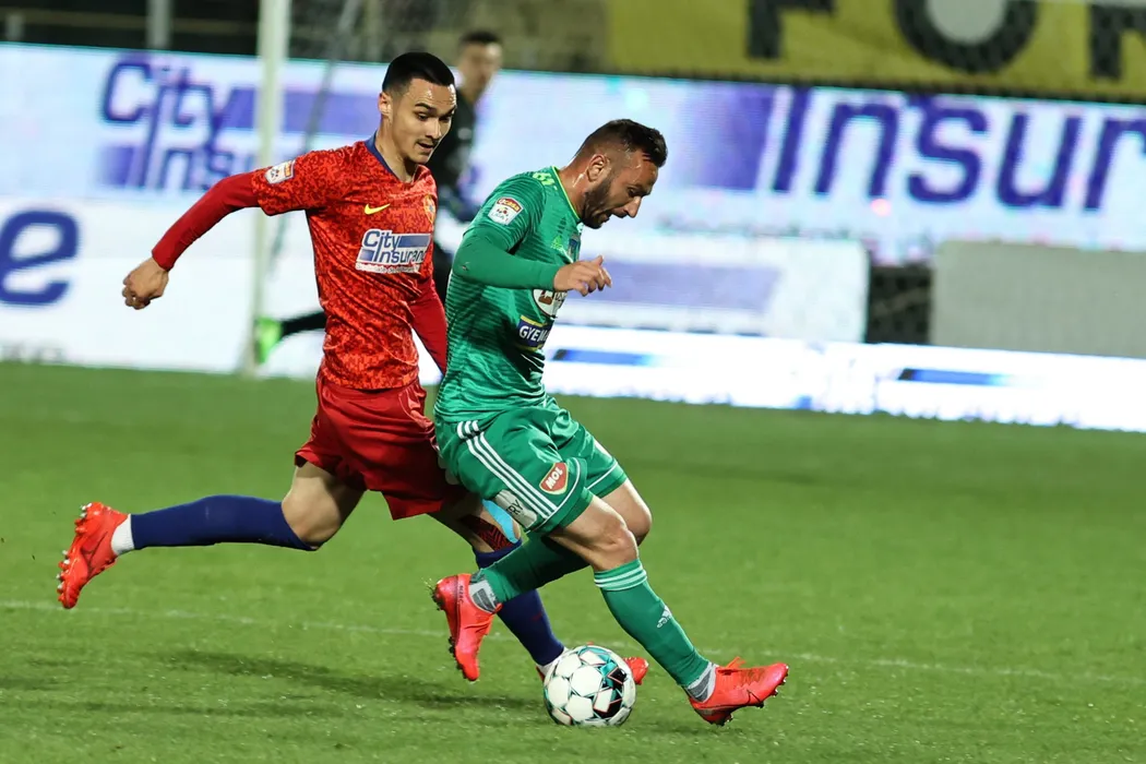 Adrian Sut (S), de la FCSB, lupta pentru balon cu Radoslav Dimitrov(D), de la Sepsi OSK, in meciul de fotbal din etapa 3 a play-off-ului Ligii 1, disputat pe stadionul Marin Anastasovici din Giurgiu, duminica, 25 aprilie 2021. GEORGE FILIP / MEDIAFAX FOTO