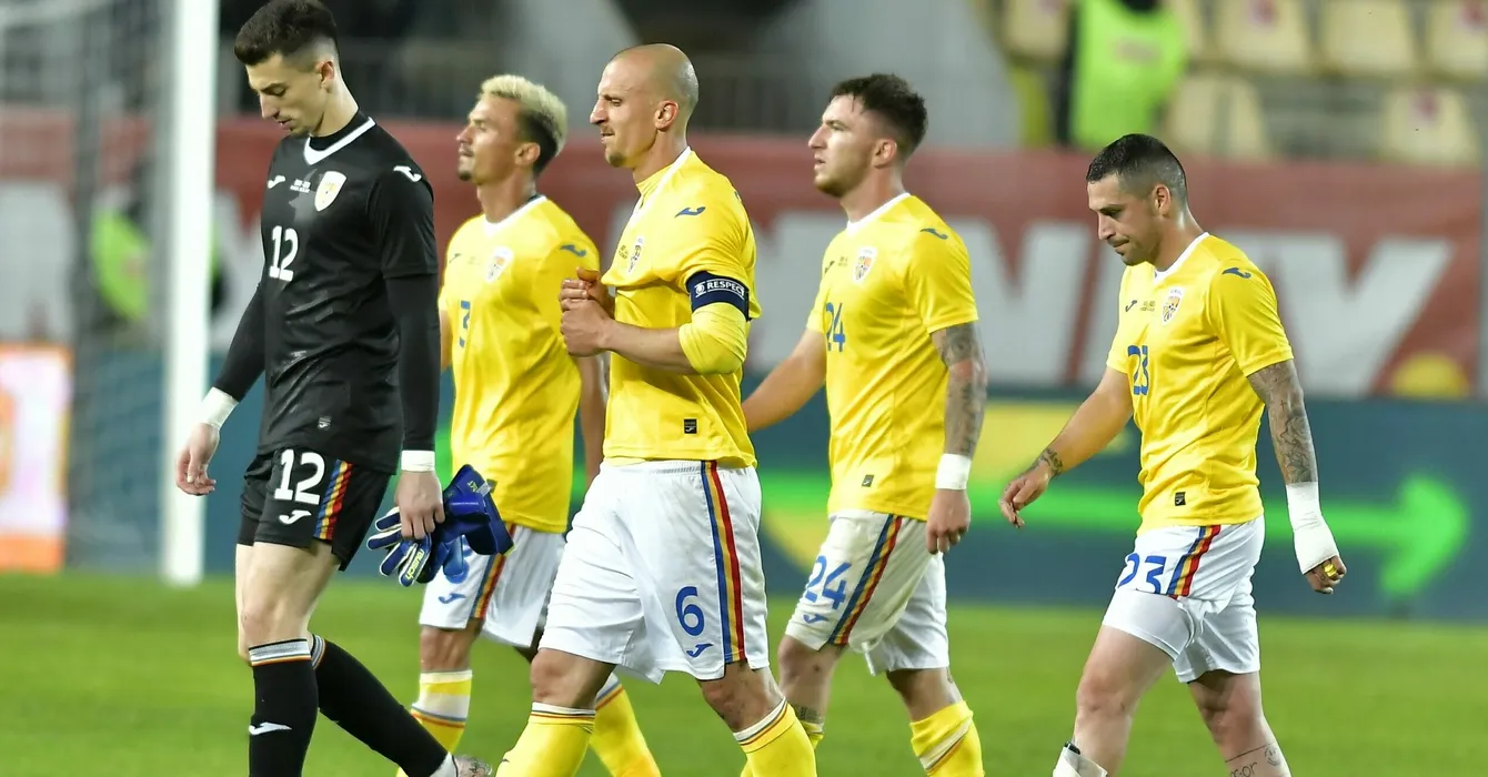 Fotbalistii romani Andrei Vlad, Deian Sorescu si Florin Stanciu suparati dupa meciul amical de fotbal dintre Romania si Georgia, disputat pe Stadionul Ilie Oana din Ploiesti, miercuri 2 iunie 2021. © FOTO:Razvan Pasarica/SPORT PICTURES