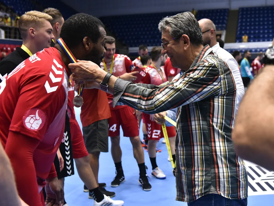 Cedric Sorhaindo este premiat de catre Valentin Samungi dupa meciul de handbal masculin dintre Dinamo Bucuresti si Steaua Bucuresti, contand pentru Supercupa Romaniei, desfasurat in Sala Ioan Kunst Ghermanescu-Polivalenta din Bucuresti, joi 18 august 2022. © FOTO:Razvan Pasarica/SPORT PICTURES