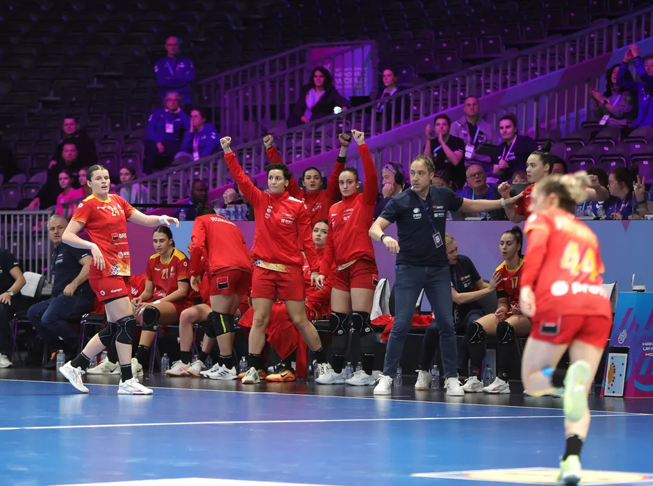 Bucurie pe banca de rezerve a Romaniei in meciul de handbal feminin dintre Romania si Croatia, contand pentru Campionatul Mondial de Handbal Feminin 2025, desfasurat la Ahoy Arena din Rotterdam, joi 27 noiembrie 2025. © FOTO:Sorin Pana/SPORT PICTURES