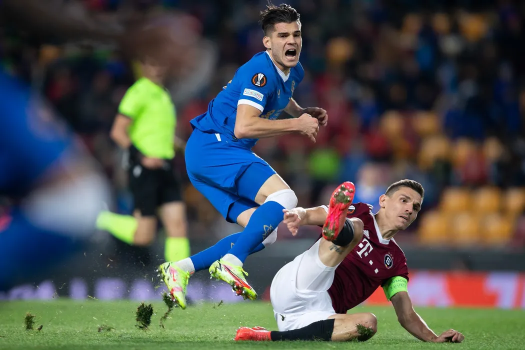 Praha 30.9.2021 SPARTA RANGERS FOTBAL EVROPSKÁ LIGA AC Sparta Praha vs. Glasgow Rangers FC . Základní skupina Evropské ligy. Skupina A. David Pavelka vs. Ianis Hagi. MICHAL SVÁČEK,Image: 635730309, License: Rights-managed, Restrictions: Image must be credited: 'MICHAL SVĂÄŚEK / MAFRA / Profimedia', Model Release: no, Credit line: Profimedia