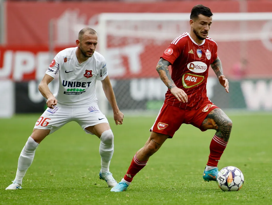 Cosmin Gabriel Matei și Silviu Nicolae Balaure în meciul de fotbal dintre AFC Hermannstadt Sibiu si Sepsi OSK Sfântu Gheorghe, petru Superliga Superbet, desfășurat pe Stadionul Municipal din Sibiu, duminică 6 octombrie 2024. © FOTO: Ovidiu MATIU/SPORT PICTURES