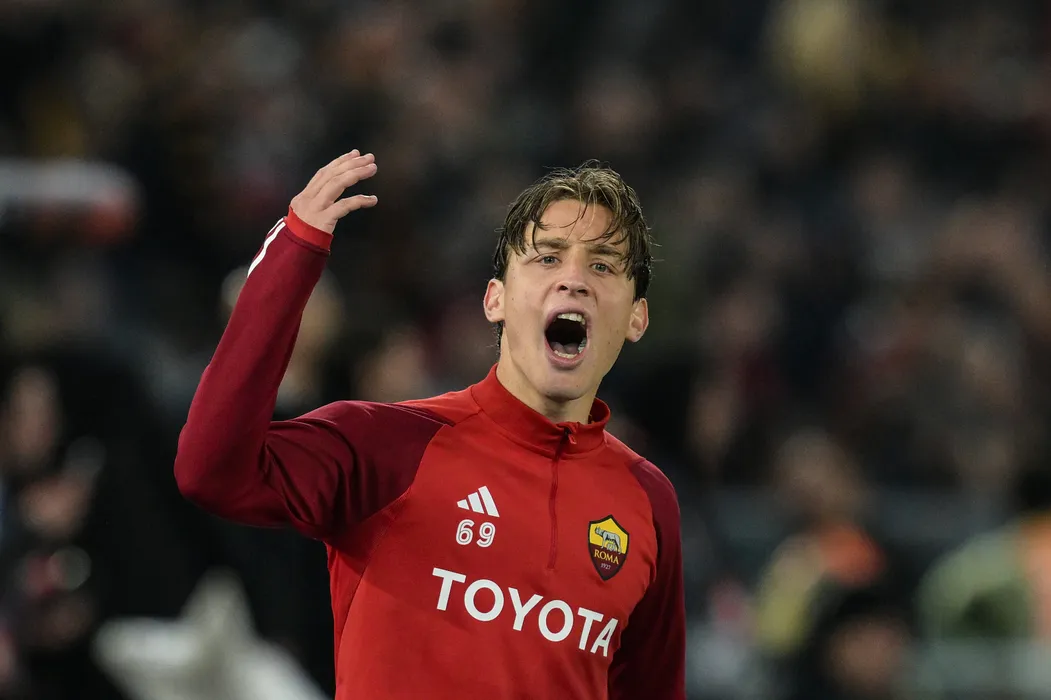 April 18, 2024, Roma, Italia: Roma's Edoardo Bove celebrates during the UEFA Europe League football match second leg of the quarter-finals between Roma and Milan FC at the Olympic Stadium in Rome, Italy - Thursday 18 April 2024 - Sport Soccer (photo by Alfredo Falcone/LaPresse) (Credit Image: © Alfredo Falcone/LaPresse via ZUMA Press)