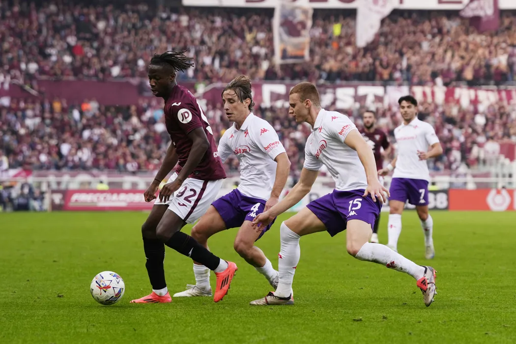 03 November 2024, Italy, Turin: Torino's Njie battles for the ball with Fiorentina's Edoardo Bove and Pietro Comuzzo, during the Italian Serie A soccer match between Torino Fc and Fiorentina at Olimpico Grande Torino Stadium. Photo: Fabio Ferrari/LaPresse via ZUMA Press/dpa