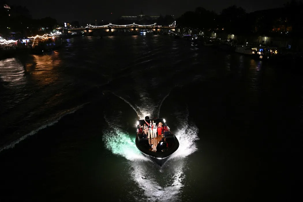 Spanish tennis player Rafael Nadal (2L) holds the Olympic torch next to US' athlete Carl Lewis (L), Romanian gymnast Nadia Comaneci (2R) and US tennis player Serena Williams (R) on the river Seine during the opening ceremony of the Paris 2024 Olympic Games in Paris on July 26, 2024.,Image: 892765919, License: Rights-managed, Restrictions: , Model Release: no