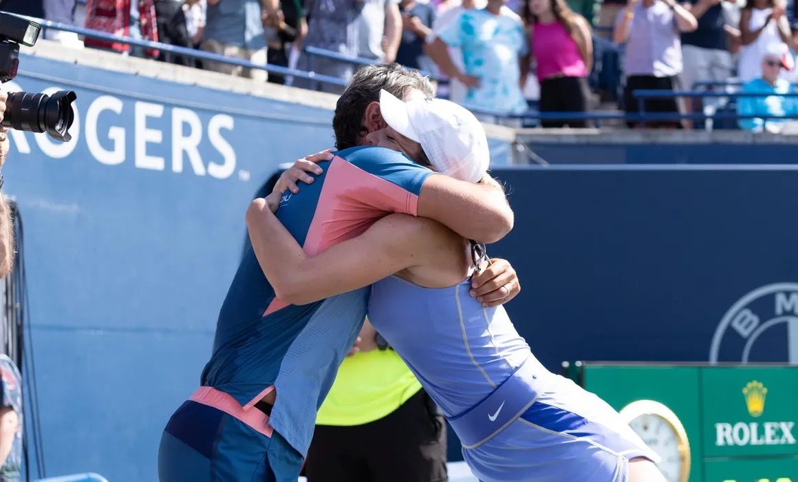 August 14, 2022, Toronto, Ontario, Canada: Coach PATRICK MOURATOGLOU hugs SIMONA HALEP after she defeated Beatriz Haddad Maia 3-6, 6-2, 3-6 to win the National Bank Open in Toronto Canada.,Image: 714022992, License: Rights-managed, Restrictions: , Model Release: no