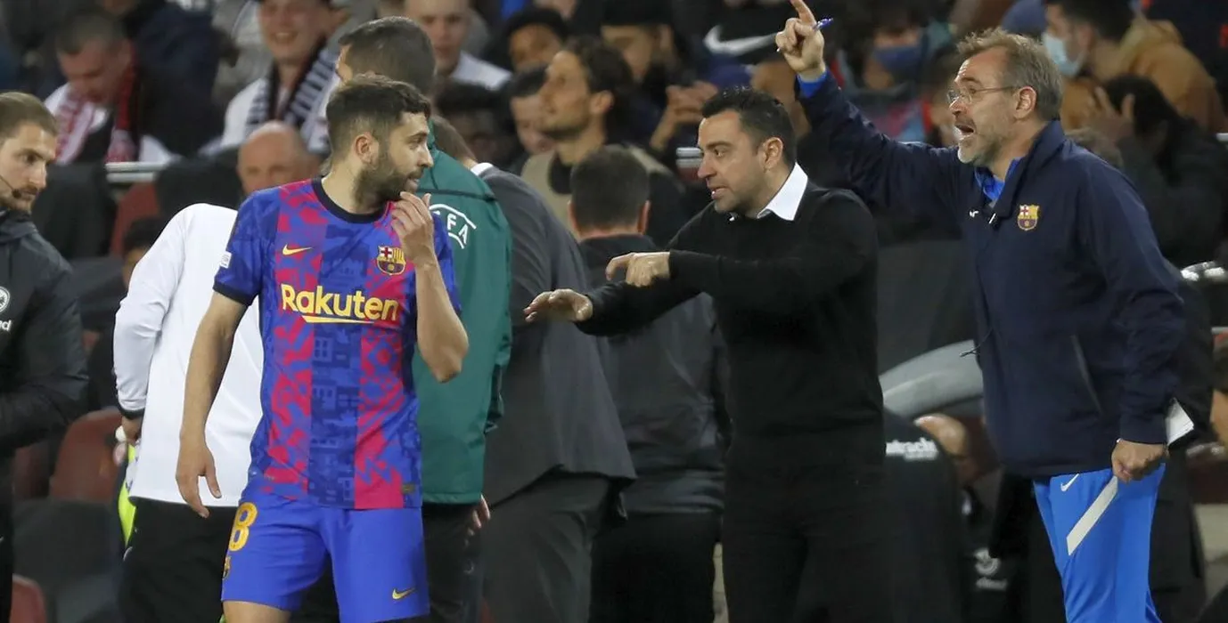 Jordi Alba (18 FC Barcelona) and Xavi Hernandez (Coach FC Barcelona) receiving instructions during, UEFA Europa League match between Barcelona and Eintracht at Camp Nou stadium in Barcelona, Spain.