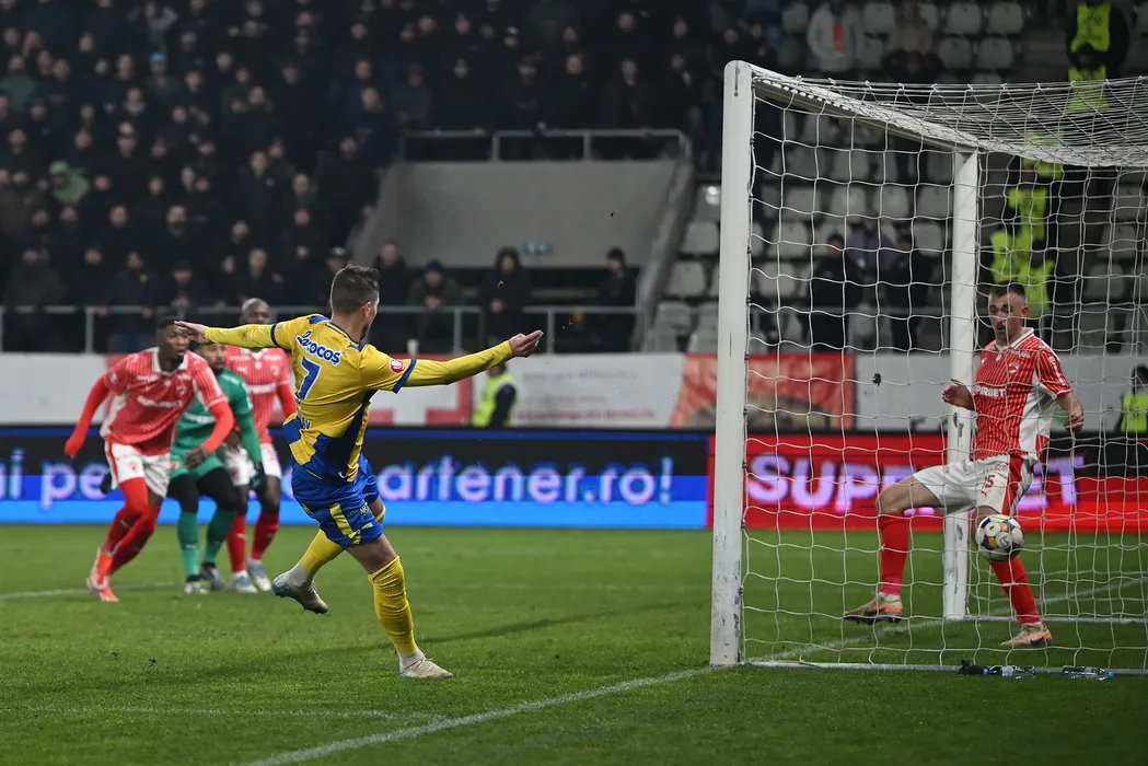 Gheorghe Teodor Grozav marchează un gol cu toata opozitia lui Nikita Stoinov in meciul de fotbal dintre Dinamo Bucuresti si Petrolul Ploiesti, din cadrul Superligii Superbet, desfasurat pe Stadionul Arcul de Triumf din Bucuresti, vineri 30 ianuarie 2026. © FOTO:Razvan Pasarica/SPORT PICTURES