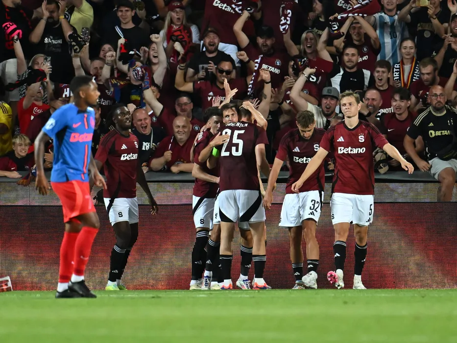 Kaan Kairinen este felicitat de fotbalistii cehi dupa un gol marcat in meciul dintre Sparta Praga si FCSB, contand pentru Preliminariile Ligii Campionilor, desfasurat pe Stadionul Letna din Praga, marti 6 august 2024. © FOTO:Razvan Pasarica/SPORT PICTURES