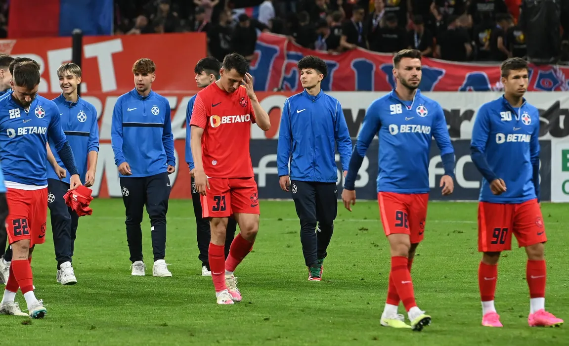 Fotbalistii stelisti Deian Cristian Sorescu si Risto Radunovic parasesc tristi terenul dupa meciul de fotbal dintre FCSB si Rapid Bucuresti, contand pentru Play-off-ul Superligii Superbet, desfasurat pe Arena Nationala din Bucuresti, sambata 27 mai 2023. © FOTO:Razvan Pasarica/SPORT PICTURES