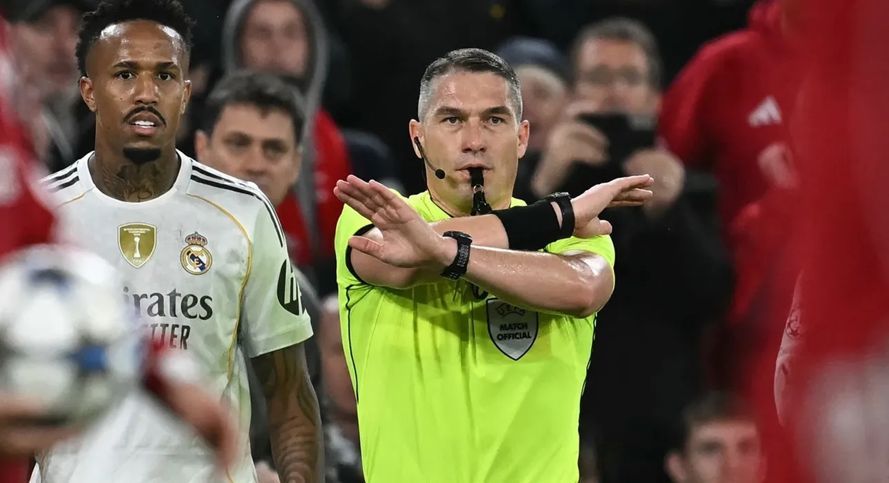 Romanian referee Istvan Kovacs indicates no penalty after consulting the pitch-side monitor during the UEFA Champions League, league phase football match between Liverpool and Real Madrid at Anfield in Liverpool, north west England on November 4, 2025.,Image: 1050338053, License: Rights-managed, Restrictions: , Model Release: no, Credit line: Paul ELLIS / AFP / Profimedia