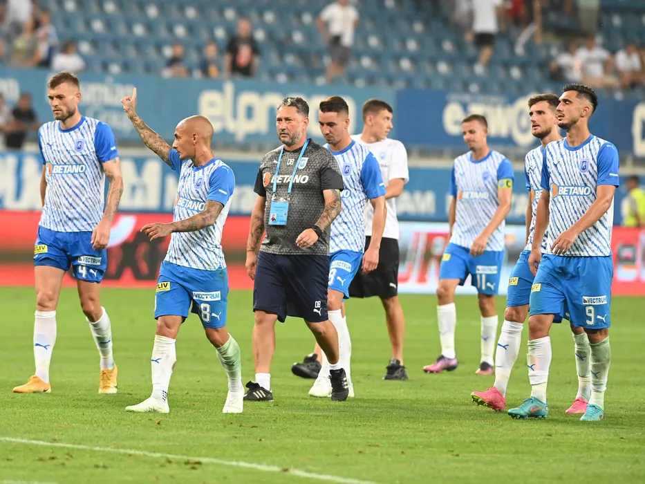 Fotbalistii craioveni Alexandru Cretu, Ionut Alexandru Mitrita, Alexandru Mateiu, Cristian Mihai Capatina si Andrei Virgil Ivan saluta publicul dupa meciul de fotbal dintre Universitatea Craiova si Otelul Galati, contand pentru Superliga Superbet, desfasurat pe Stadionul Ion Oblemenco din Craiova, luni 24 iulie 2023. © FOTO:Razvan Pasarica/SPORT PICTURES