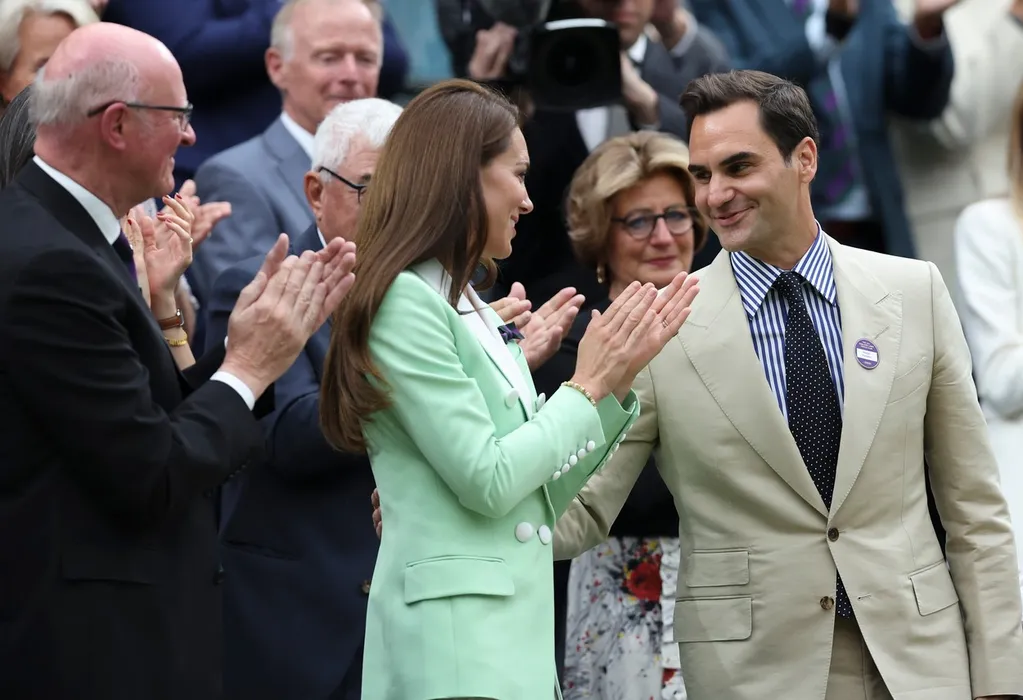 LONDON, July 4, 2023 -- Roger Federer (front R) talks to Britain's Catherine (front C), Princess of Wales, at Centre Court ahead of play on Day 2 of Wimbledon Tennis Championships in London, Britain, July 4, 2023.,Image: 787152654, License: Rights-managed, Restrictions: , Model Release: no