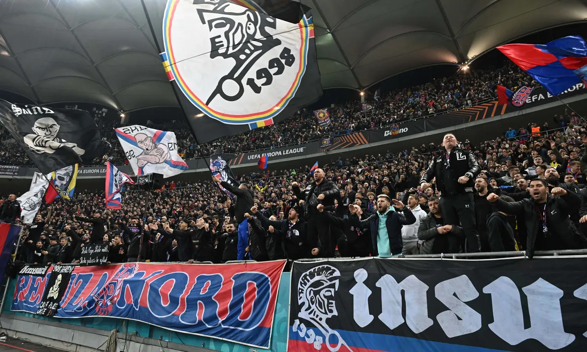Galeria stelista Peluza Nord isi incurajeaza favoritii la meciul de fotbal dintre FCSB si Midtjylland, contand pentru UEFA Europa League, desfasurat pe Arena Nationala din Bucuresti, joi 7 noiembrie 2024. © FOTO:Razvan Pasarica/SPORT PICTURES