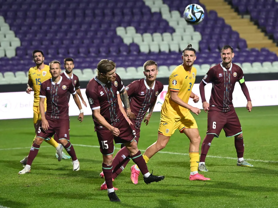 Denis Polyakov, Nikita Korzun, Zakhar Volkov, Radu Dragusin si Sergei Politevich in meciul de fotbal dintre Belarus si Romania, din cadrul preliminariilor Campionatului European 2024, desfasurat pe Stadionul Szusza Ferenc din Budapesta, joi 12 octombrie 2023. © FOTO:Razvan Pasarica/SPORT PICTURES
