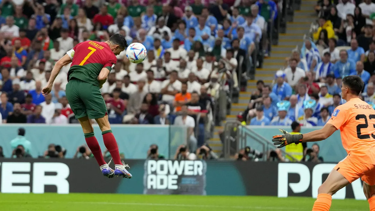 Portugal's Cristiano Ronaldo scores the opening goal during the World Cup group H soccer match between Portugal and Uruguay, at the Lusail Stadium in Lusail, Qatar, Monday, Nov. 28, 2022. (AP Photo/Petr David Josek)