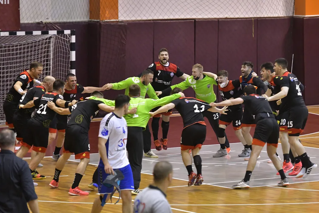 Hora a bucuriei bacauane dupa callificarea in semifinalele competitiei dupa meciul de handbal masculin dintre Minaur Baia Mare si CSM Bacau, contand pentru Cupa Romaniei Fan Courier, desfasurat fara spectatori in Sala Rapid din Bucuresti, joi 27 mai 2021. © FOTO:Razvan Pasarica/SPORT PICTURES