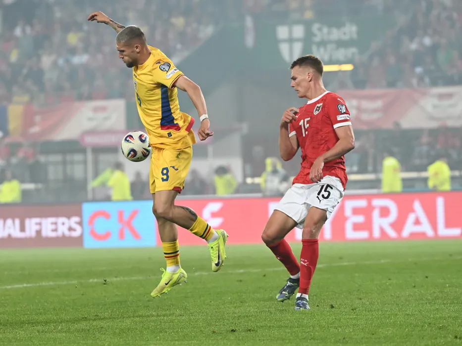 Daniel Birligea si Philipp Lienhart in meciul de fotbal dintre Austria si Romania, din cadrul Preliminariilor Campionatului Mondial 2026, desfasurat pe Stadionul Ernst Happel din Viena, sambata 7 iunie 2025. © FOTO:Razvan Pasarica/SPORT PICTURES