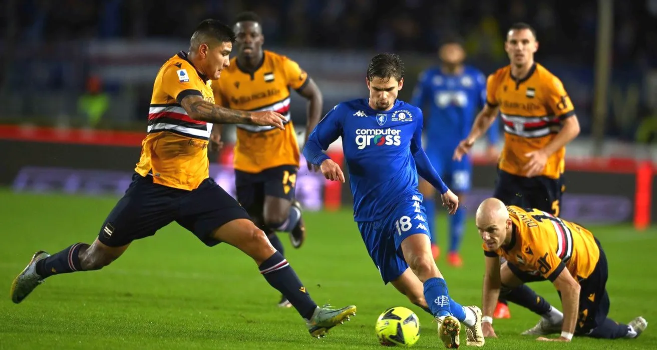 Bruno Amione (Sampdoria)Razvan Marin (Empoli)Bram Nuytinck (Sampdoria) during the Italian "Serie A match between Empoli 1-0 Sampdoria at Carlo Castellani Stadium on January 16, 2023 in Empoli, Italy. (Photo by Maurizio Borsari/AFLO),Image: 750123963, License: Rights-managed, Restrictions: No third party sales, Model Release: no