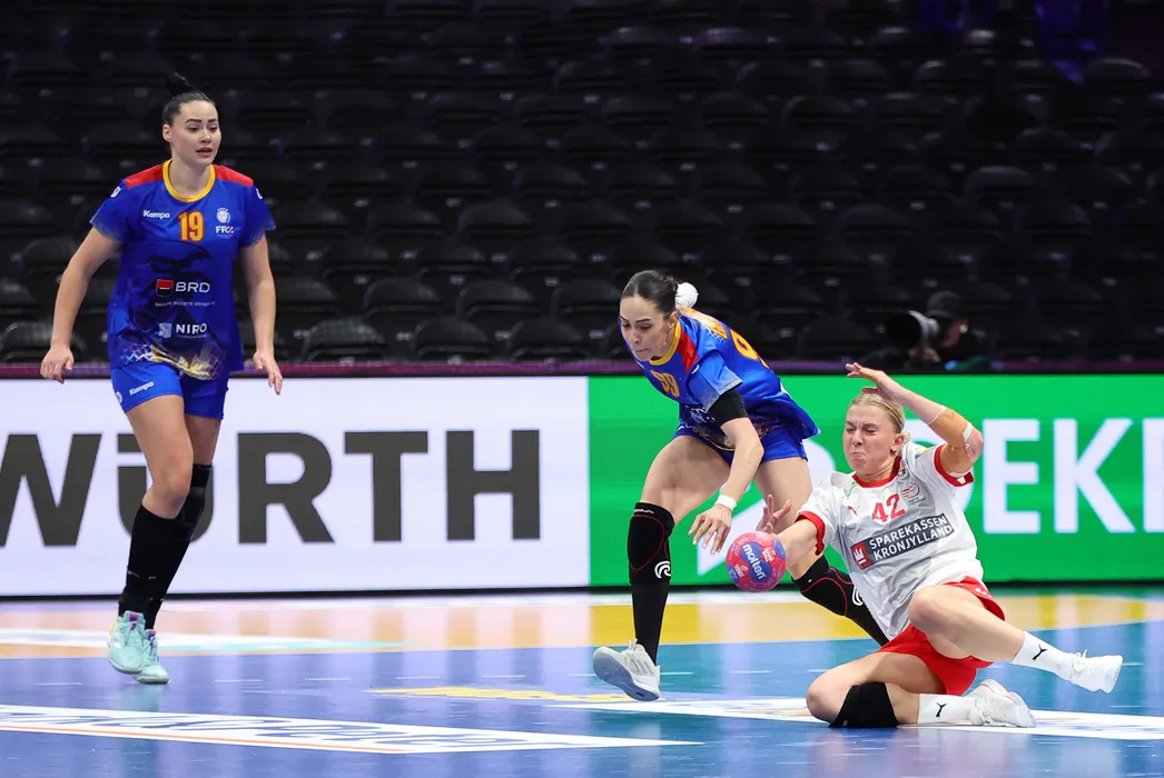 Maryia Skrobic si Sorina-Maria Grozav care recupereaza mingea de la Michaela Elsberg Moller in meciul de handbal feminin dintre Danemarca si Romania, contand pentru Campionatul Mondial de Handbal Feminin 2025, desfasurat la Ahoy Arena din Rotterdam,luni 1 decembrie 2025. © FOTO:Sorin Pana/SPORT PICTURES