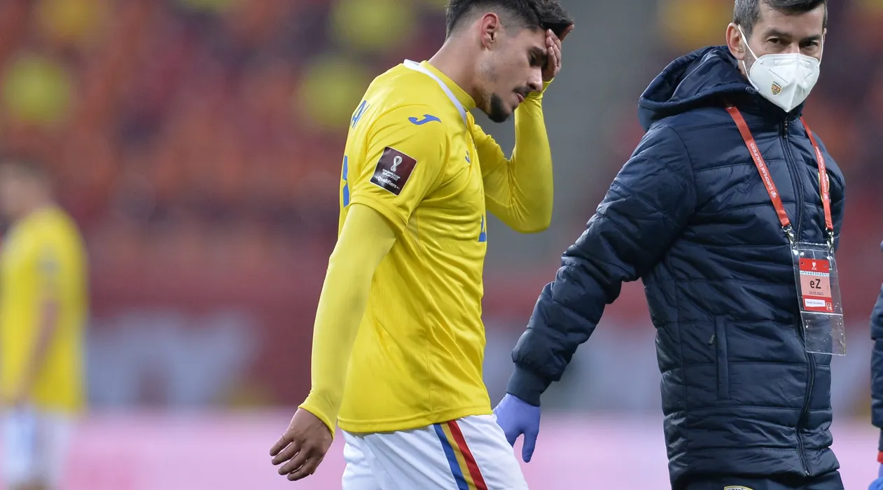 Reprezentativele Romaniei (echipament galben) si Macedoniei de Nord s-au intalnit intr-o partida contand pentru preliminariile CM 2022, joi 25 noiembrie 2021, pe Arena Nationala din Bucuresti. ALEXANDRU DOBRE / MEDIAFAX FOTO