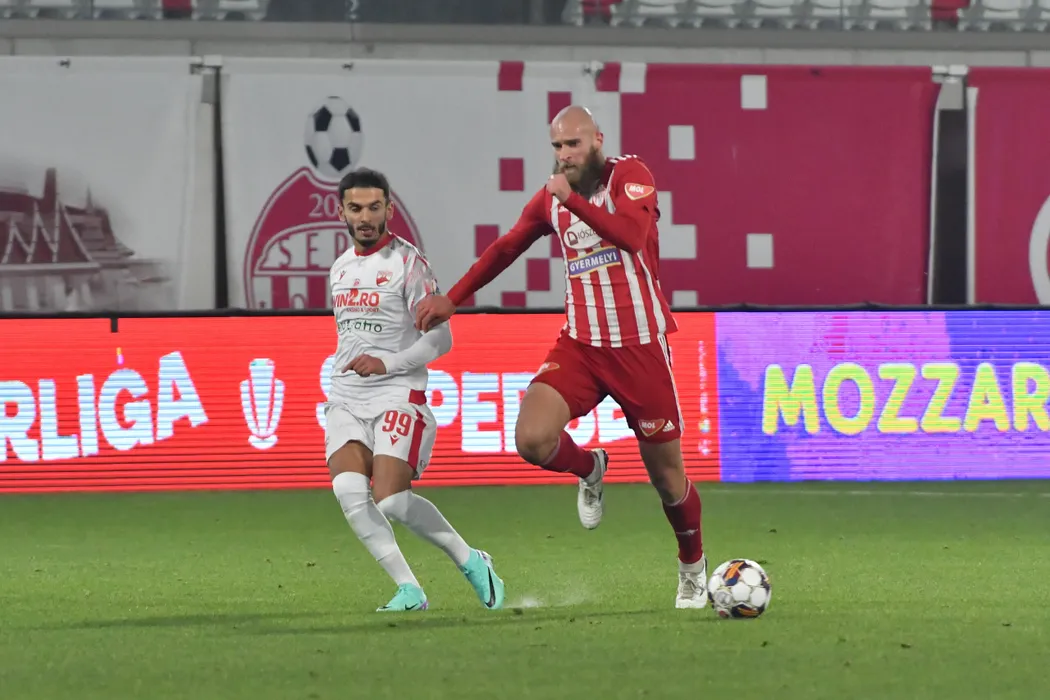 Branislav Ninaj și Lamine Ghezali în meciul de fotbal dintre FC Sepsi OSK Sfantu Gheorghe și SC Dinamo 1948 Bucuresti, contând pentru SuperLiga Superbet, desfășurat pe Stadionul SEPSI Arena OSK din Sfântu Gheorghe, luni 4 decembrie 2023. © FOTO: Bogdan BALAS/SPORT PICTURES