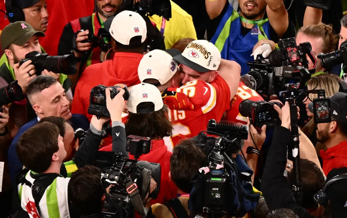 Kansas City Chiefs' tight end #87 Travis Kelce celebrates winning Super Bowl LVIII against the San Francisco 49ers at Allegiant Stadium in Las Vegas, Nevada, February 11, 2024.,Image: 845754158, License: Rights-managed, Restrictions: , Model Release: no