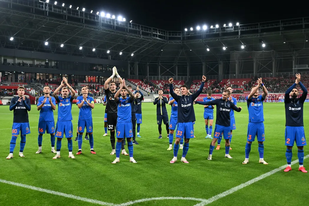 Fotbalistii stelisti Eduard Gabriel Radaslavescu, Mihai Daniel Lixandru, Grigoras Alexandru Pantea, Adrian Gheorghe Sut, Stefan Tarnovanu, Florinel Teodor Coman, Denis Gratian Harut, Risto Radunovic, Darius Dumitru Olaru, Ionut Constantin Pantiru si Valentin Cretu saluta galeria dupa meciul de fotbal dintre Sepsi OSK Sfantu Gheorghe si FCSB, contand pentru Superliga Superbet, desfasurat pe Sepsi Arena din Sfantu Gheorghe, duminica 24 septembrie 2023. © FOTO:Razvan Pasarica/SPORT PICTURES