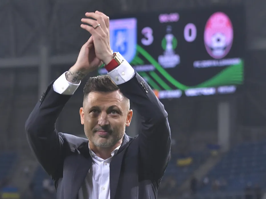 Noul antrenor al Craiovei, Mirel Radoi, saluta galeria alaturi de tabela de marcaj dupa meciul de fotbal dintre Universitatea Craiova si FC Zorya Luhansk, din cadrul UEFA Europa Conference League, desfasurat pe Stadionul Ion Oblemenco din Craiova, joi 11 august 2022. © FOTO:Razvan Pasarica/SPORT PICTURES