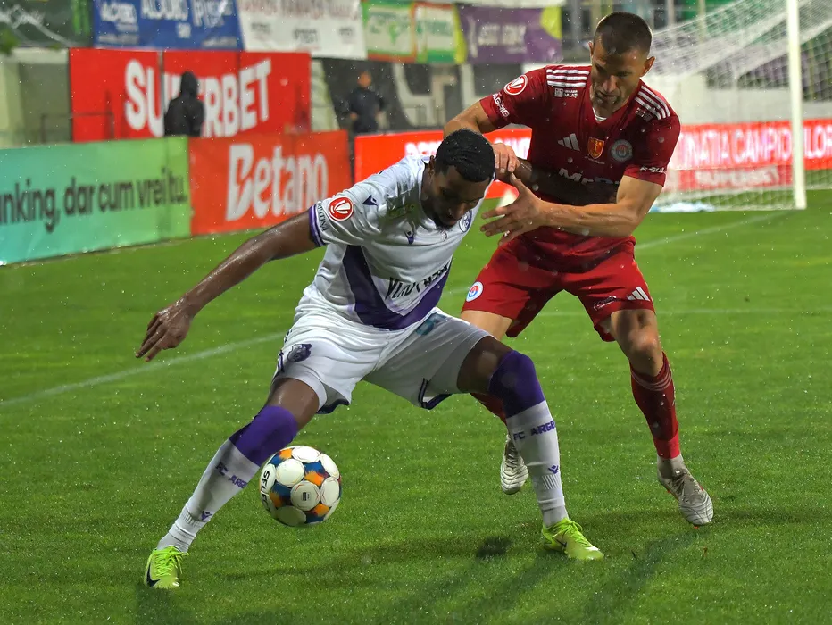 Adel Bettaieb si Milen Zhelev in meciul de fotbal dintre FC Arges si SC Otelul Galati, contand pentru Superliga Superbet, desfasurat pe Stadionul Orasenesc din Mioveni, luni 18 august 2025. © FOTO:Mihai Nitoiu/SPORT PICTURES