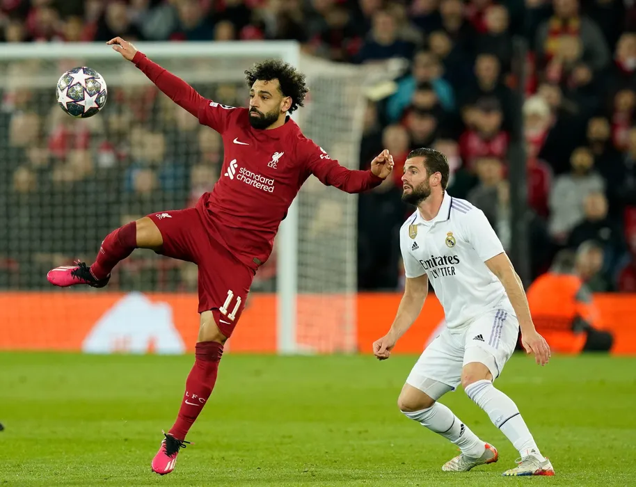 February 21, 2023, Liverpool: Liverpool, England, 21st February 2023. Mohamed Salah of Liverpool controls the ball in front of Nacho Fernandez of Real Madrid during the UEFA Champions League match at Anfield, Liverpool.,Image: 757666011, License: Rights-managed, Restrictions: This content is intended for editorial use only. For other uses, additional clearances may be required.