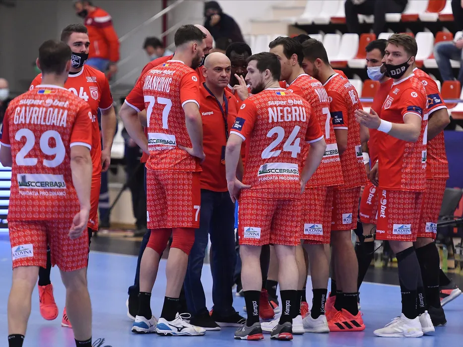 Stefan Constantin la un timeout alaturi de handbalistii dinamovisti Nicusor Andrei Negru si Octavian Catalin Bizau in meciul de handbal masculin dintre Dinamo Bucuresti si USAM Nimes Gard, contand pentru Liga Europeana EHF, desfasurat fara spectatori in Sala Dinamo din Bucuresti, marti 24 noiembrie 2020. © FOTO:Razvan Pasarica/SPORT PICTURES