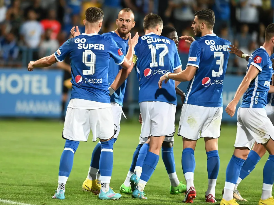 Denis Alibec se bucura dupa un gol marcat alaturi de Mihai Popescu si Louis Munteanu in meciul de fotbal dintre Farul Constanta si FCSB, contand pentru Superliga Superbet, desfasurat pe Stadionul central al Academiei Gheorghe Hagi din Ovidiu, miercuri 31 august 2022. © FOTO:Razvan Pasarica/SPORT PICTURES