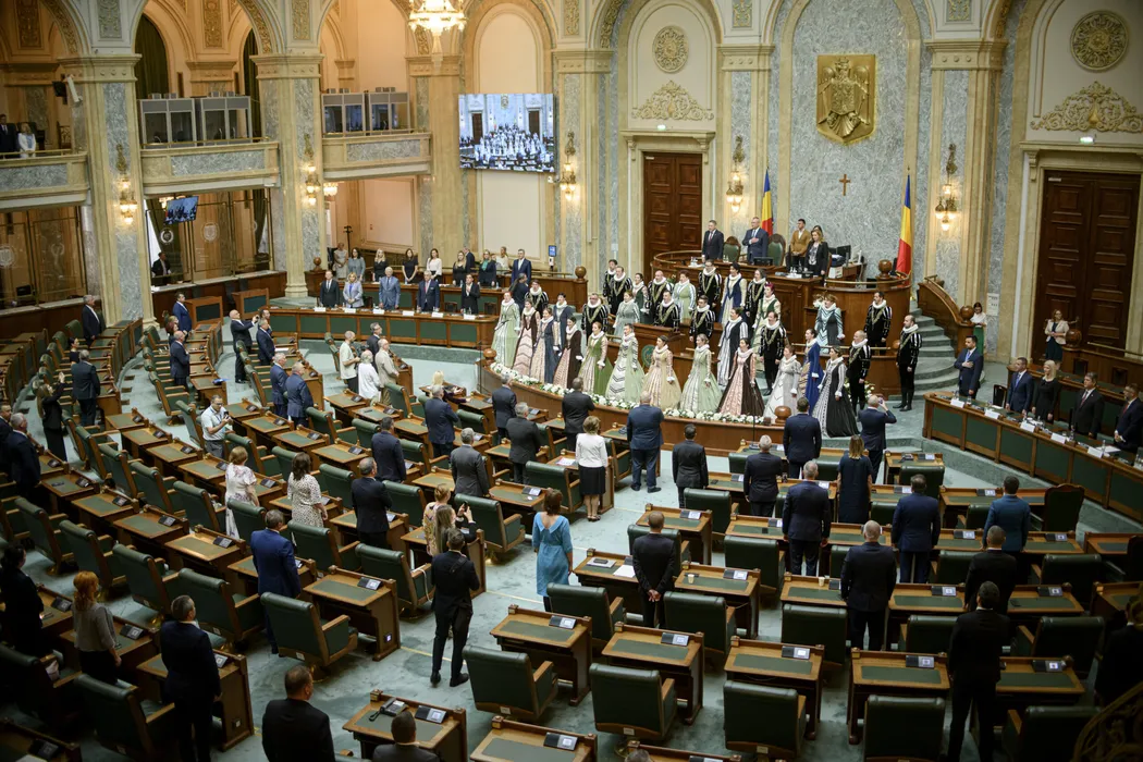Corul Madrigal intoneaza imnul Romaniei in timpul sesiunii solemne consacrate aniversarii a 160 de ani de la constituirea Senatului Romaniei, la Palatul Parlamentului, in Bucuresti, luni, 17 iunie 2024. ALEXANDRU DOBRE/ MEDIAFAX FOTO.