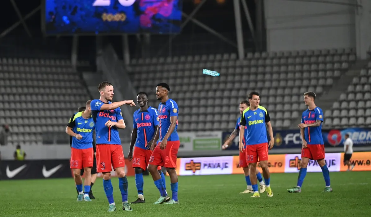 Fotbalistii stelisti Ionuț Constantin Panțîru, Baba Alhassan, Siyabonga Ngezana, Risto Radunovic si David Raul Miculescu alături de tabela de marcaj dupa meciul de fotbal dintre FCSB și UTA Arad, contând pentru Superliga Superbet, desfășurat pe Stadionul Arcul de Triumf din București, duminică 1 septembrie 2024. © FOTO: Răzvan PĂSĂRICĂ/SPORT PICTURES