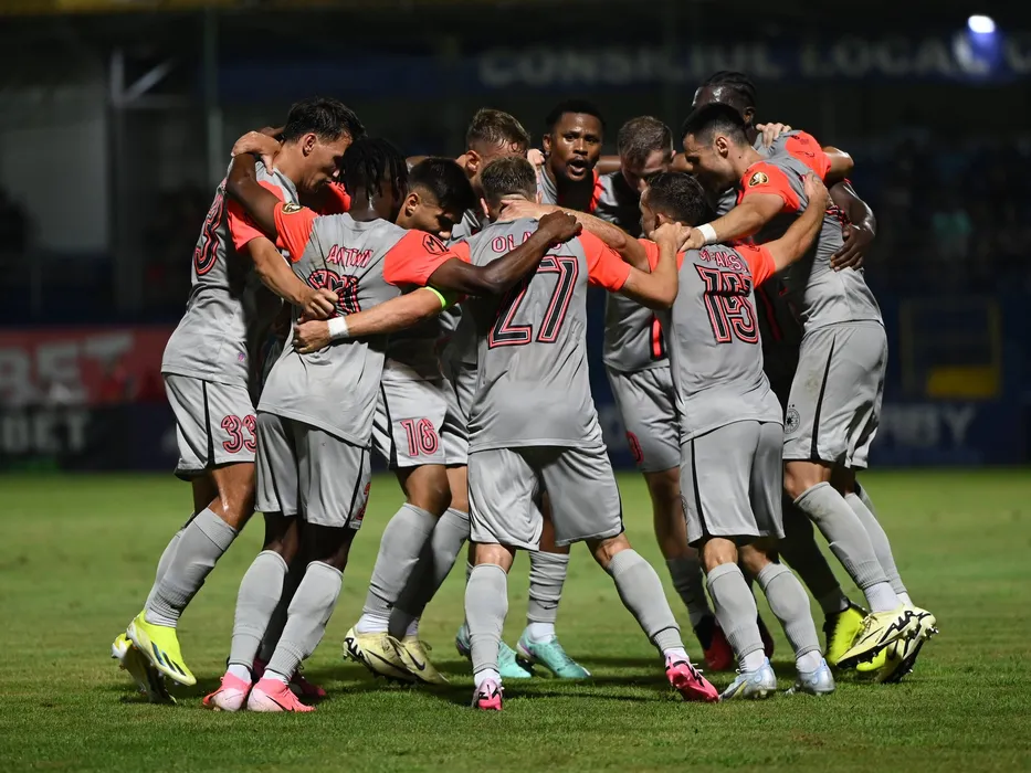 Hora a bucurieie steliste cu Risto Radunovic, Siyabonga Ngezana, Alexandru Marian Musi si Adrian Gheorghe �ut dupa un gol marcat in meciul dintre Unirea Slobozia si FCSB, contand pentru Superliga Superbet, desfasurat pe Clinceni Arena din Clinceni, vineri 19 iulie 2024. Bucuresti *** Hora a bucurieie steliste with Risto Radunovic, Siyabonga Ngezana, Alexandru Marian Musi and Adrian Gheorghe �ut after a goal scored in the match between Unirea Slobozia and FCSB, Super League Superbet, played at Clinceni Arena in Clinceni, Friday, July 19, 2024 Bucharest Copyright: xRazvanxPasarica/SPORTxPICTURESx,Image: 894090555, License: Rights-managed, Restrictions: Credit images as "Profimedia/ IMAGO", Model Release: no