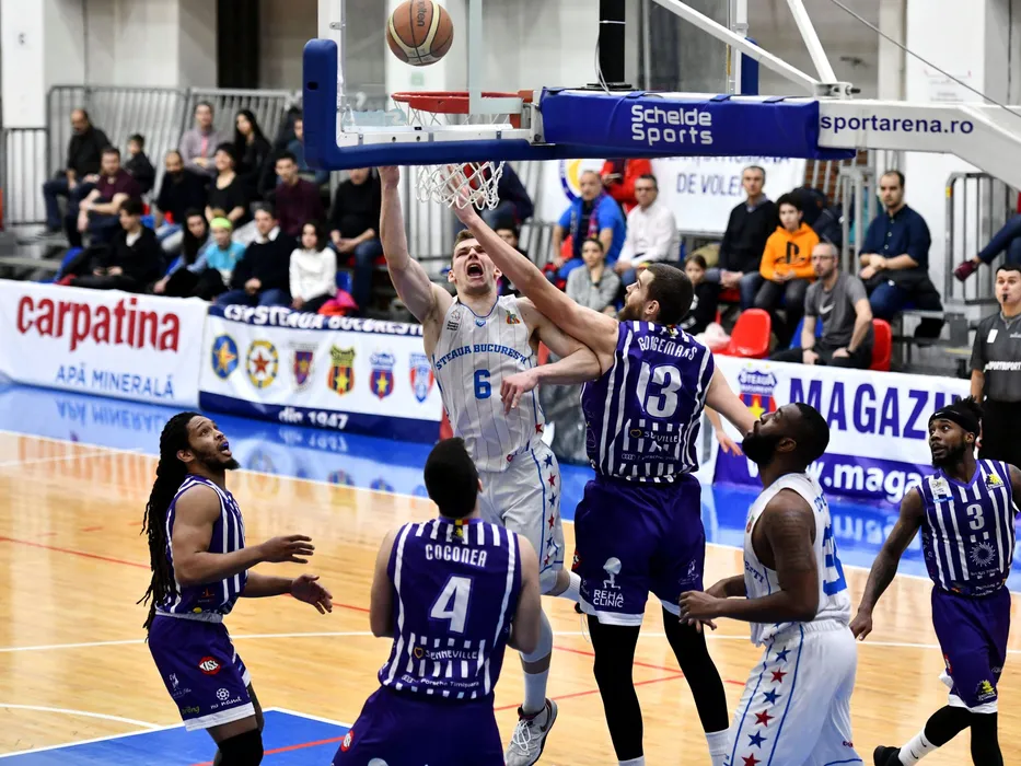 Stefan Daniel Mainea si Amaury Roland Gorgemans in meciul de baschet masculin dintre Steaua Bucuresti si BC Timisoara, contand pentru Liga Nationala, disputat in Sala Regimentului de Garda Mihai Viteazul din Bucuresti, luni 3 februarie 2019. © FOTO:Razvan Pasarica/SPORT PICTURES