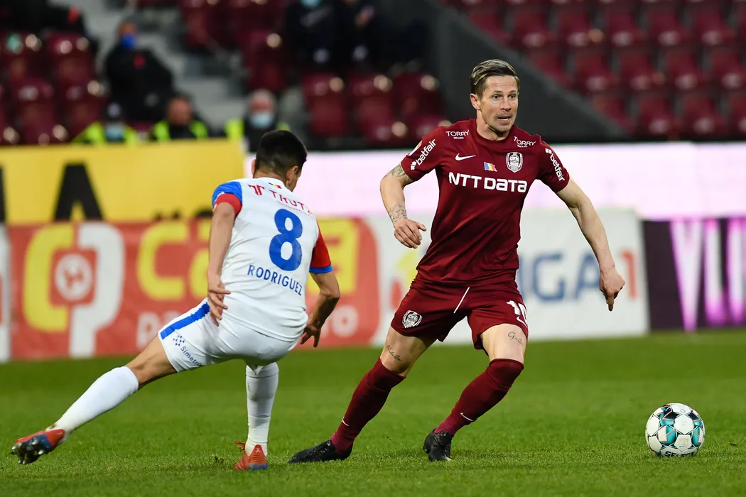 Ciprian Deac (D), de la CFR Cluj, suteaza in timpul meciului de fotbal contra echipei FC Botosani din etapa a 4-a a play-off-ului Ligii 1, disputat pe stadionul Dr. Constantin Radulescu din Cluj-Napoca, miercuri, 28 aprilie 2021. FLAVIU BUBOI / MEDIAFAX FOTO