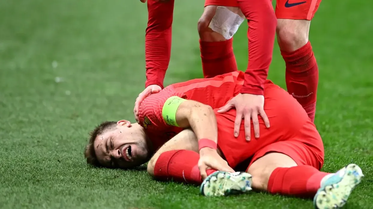 Deian Cristian Sorescu alaturi de Darius Dumitru Olaru aflat la pamant accidentat in meciul de fotbal dintre FCSB si Sepsi OSK Sfantu Gheorghe, contand pentru Superliga Superbet, desfasurat pe Arena Nationala din Bucuresti, duminica 12 martie 2023. © FOTO:Razvan Pasarica/SPORT PICTURES
