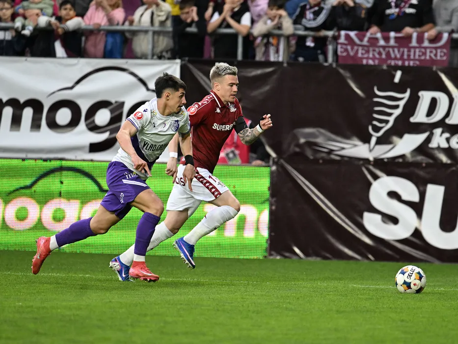 Florin Gheorghe Borta si Claudiu Adrian Mihai Petrila in meciul de fotbal dintre Rapid Bucuresti si FC Arges, din cadrul Play off-ului Superligii Superbet, desfasurat pe Superbet Arena-Giulesti din Bucuresti, luni 13 aprilie 2026. © FOTO:Razvan Pasarica/SPORT PICTURES