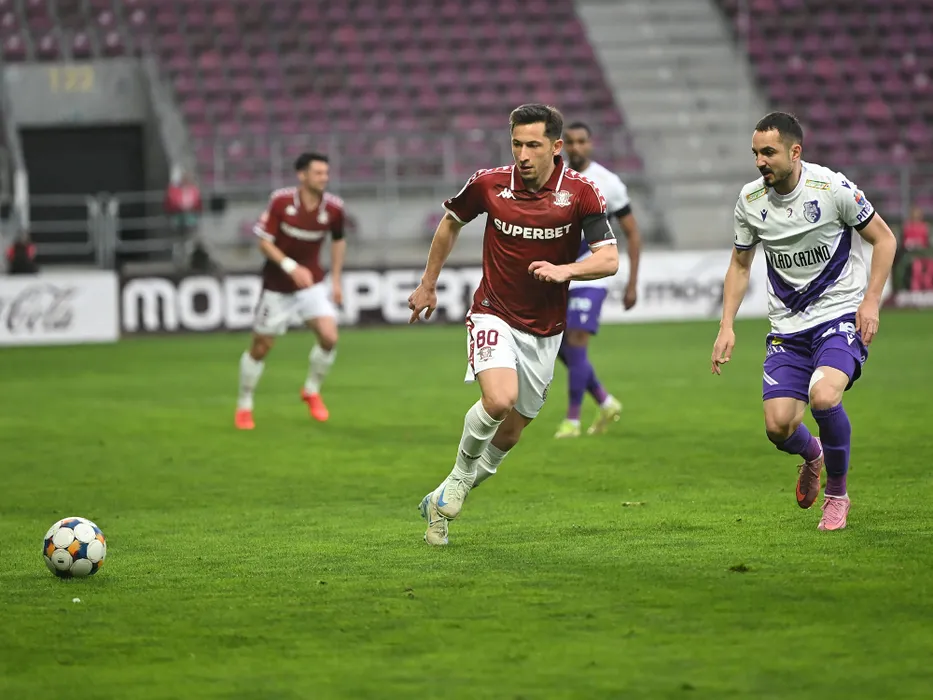 Olimpiu Vasile Morutan si Laurentiu Ionut Radescu in meciul de fotbal dintre Rapid Bucuresti si FC Arges, din cadrul Play off-ului Superligii Superbet, desfasurat pe Superbet Arena-Giulesti din Bucuresti, luni 13 aprilie 2026. © FOTO:Razvan Pasarica/SPORT PICTURES