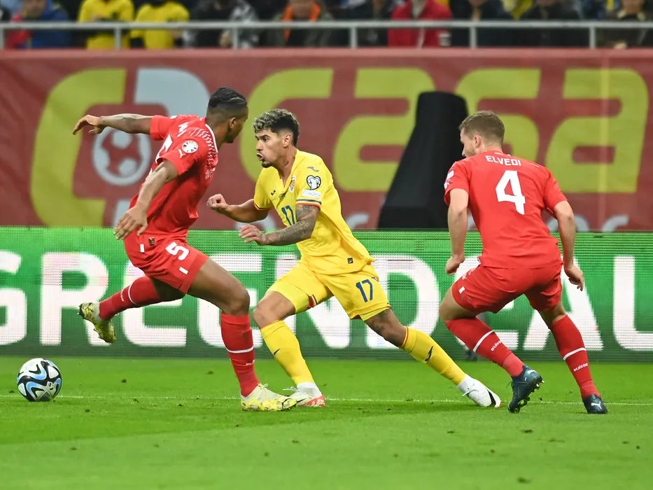Manuel Akanji si Florinel Coman in meciul de fotbal dintre Romania si Elvetia, din cadrul preliminariilor Campionatului European 2024, desfasurat pe Arena Nationala, marti 21 noiembrie 2023. © FOTO:Razvan Pasarica/SPORT PICTURES
