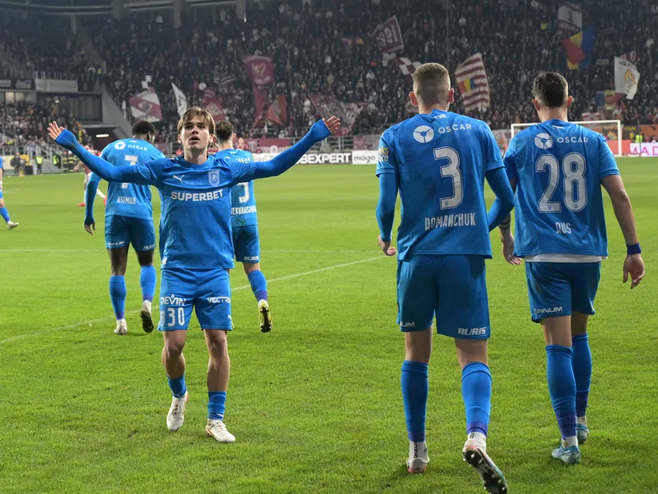 David Matei se bucura dupa un gol craiovean reusit in meciul de fotbal dintre Rapid Bucuresti si Universitatea Craiova, din cadrul Superligii Superbet, desfasurat pe Superbet Arena-Giulesti din Bucuresti, duminica 8 martie 2026. © FOTO:Razvan Pasarica/SPORT PICTURES