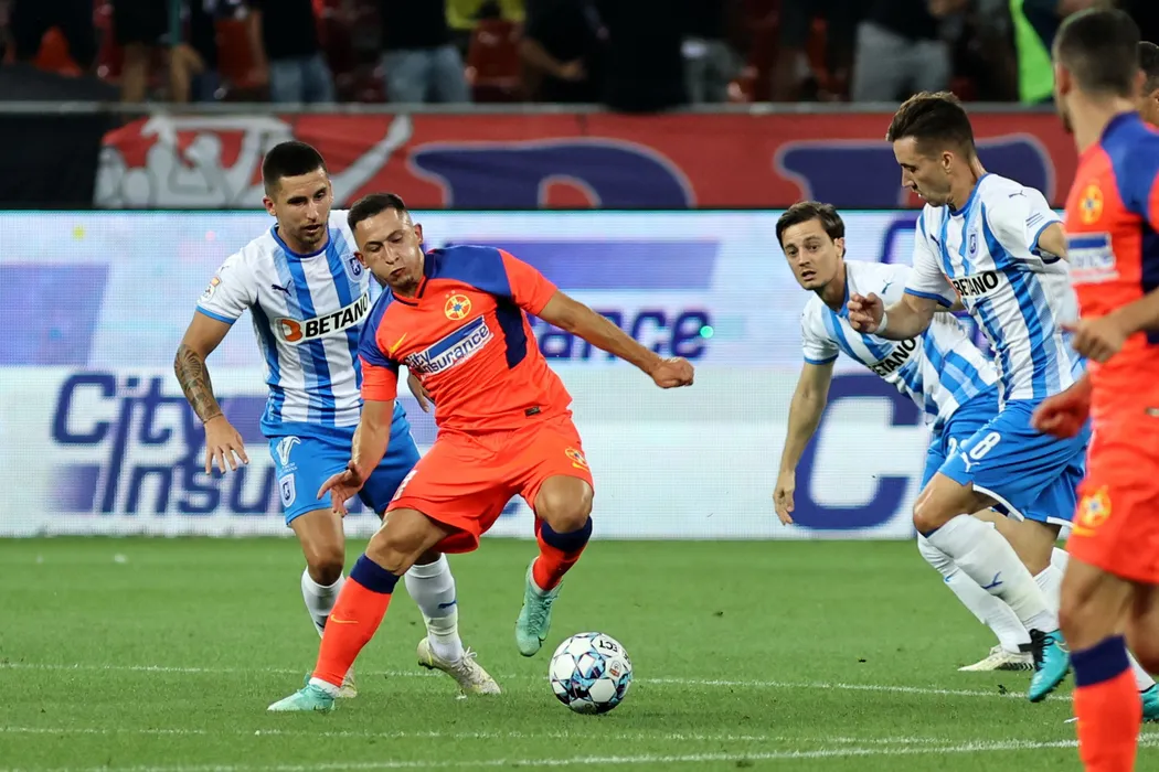 Olimpiu Morutan (D), de la FCSB, suteaza in timpul meciului de fotbal contra echipei CS Universitatea Craiova din etapa a II-a a Ligii 1, disputat pe Arena Nationala din Bucuresti, duminica, 25 iulie 2021. GEORGE FILIP / MEDIAFAX FOTO