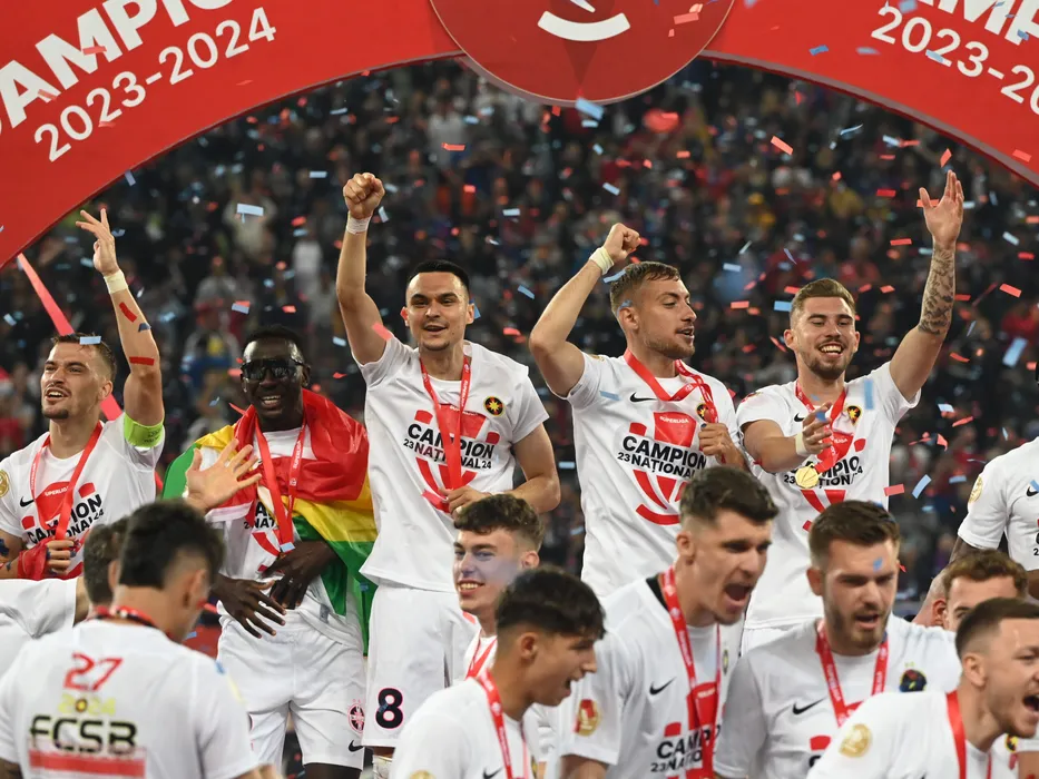Fotbalistii stelisti Octavian George Popescu, Baba Alhassan, Adrian Gheorghe Șut, Mihai Daniel Lixandru si Andrei Ionuț Pandele celebreaza castigarea Superligii in urma meciului dintre FCSB si CFR Cluj, desfășurat pe Arena Nationala din Bucuresti, sambata 11 mai 2024. © FOTO: Razvan Pasarica/SPORT PICTURES